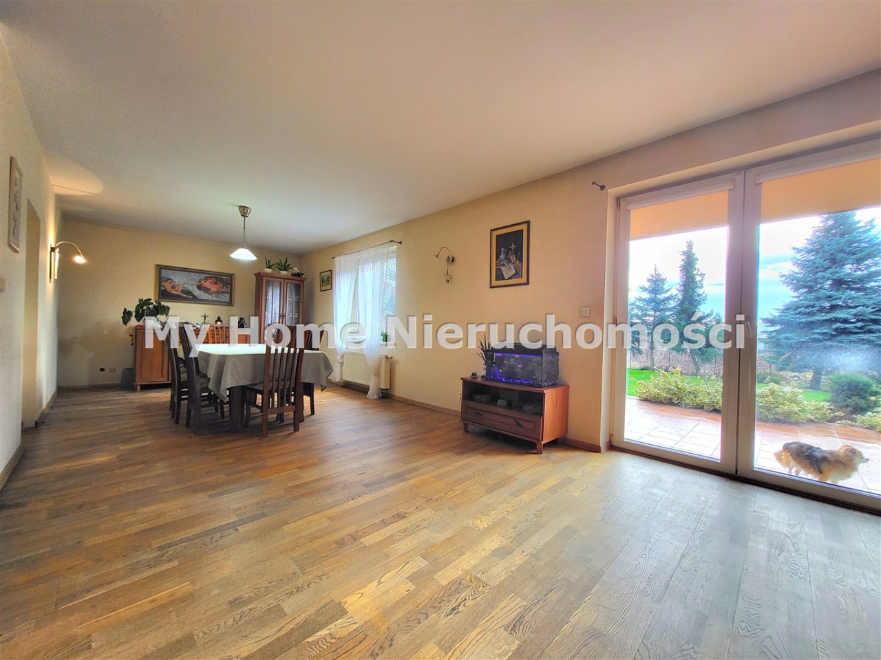 -przestronny salon z jadalnią i wyjściem na duży taras,