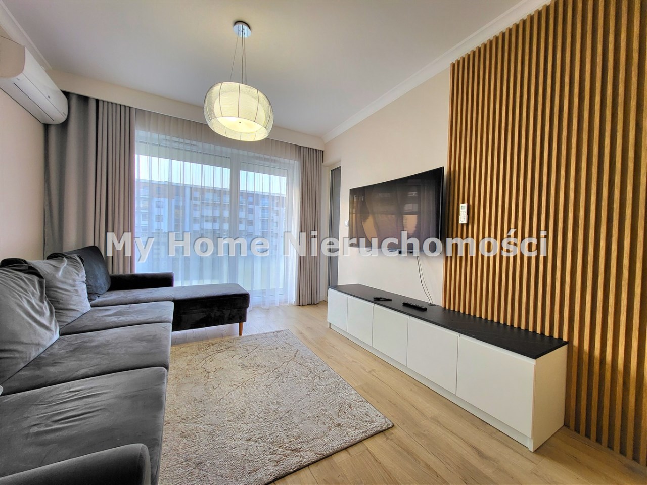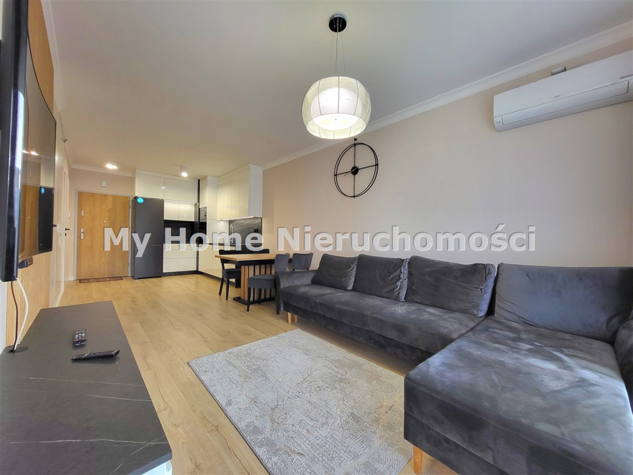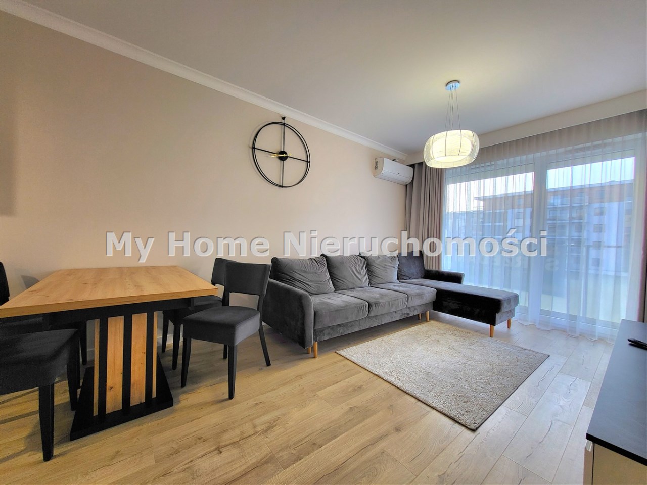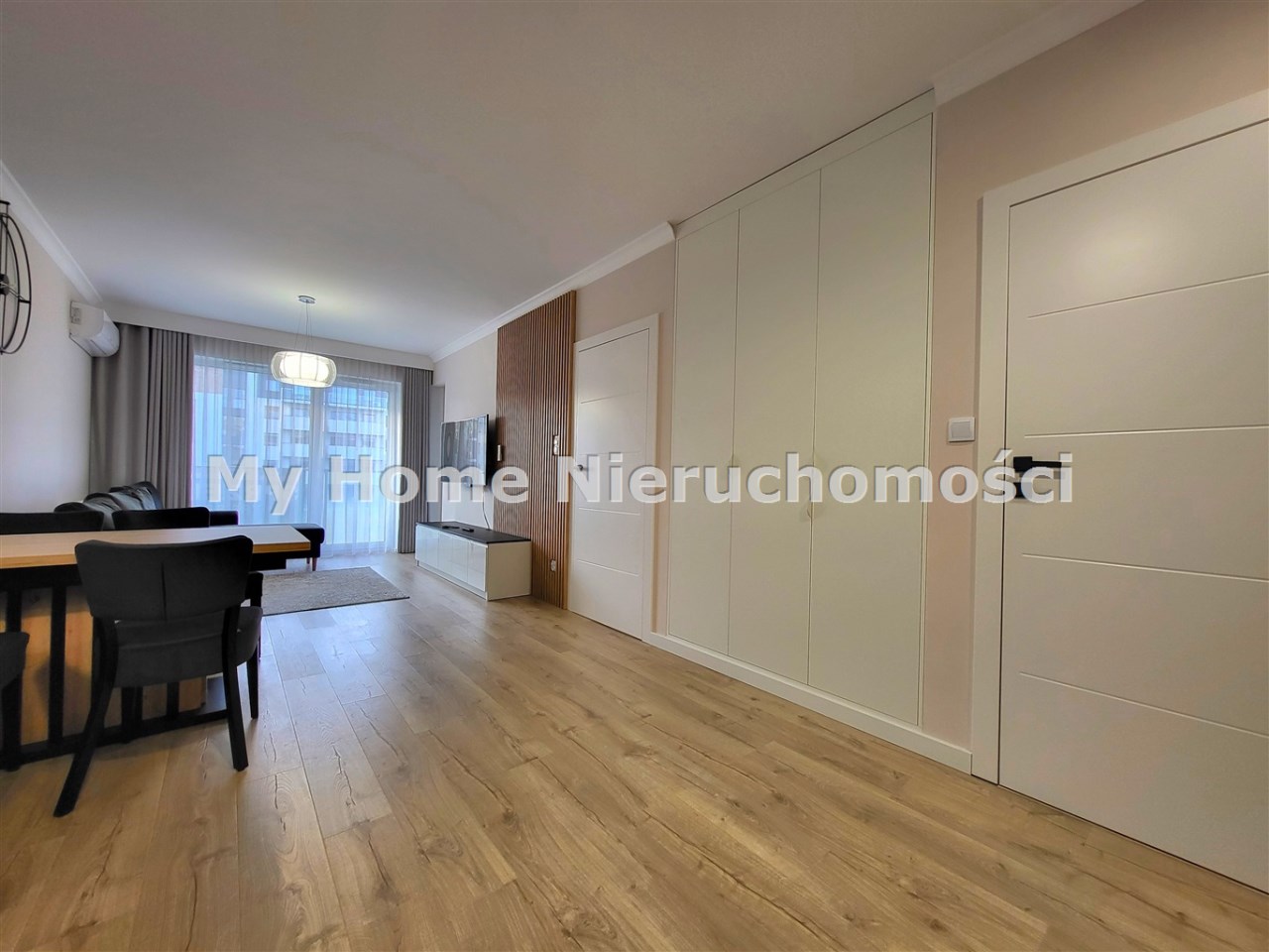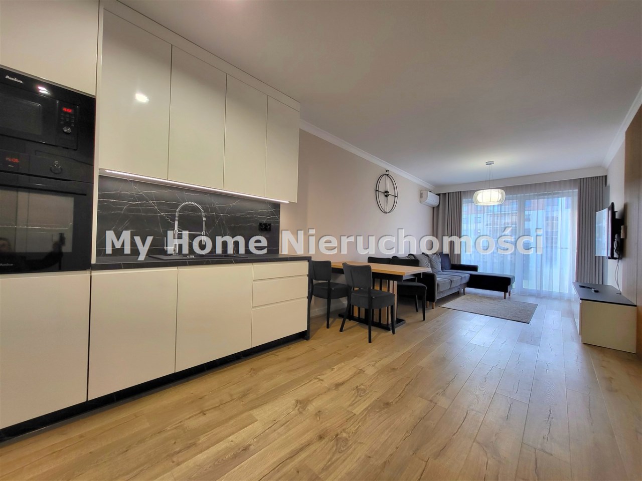 - salon z aneksem kuchennym wyjściem na balkon